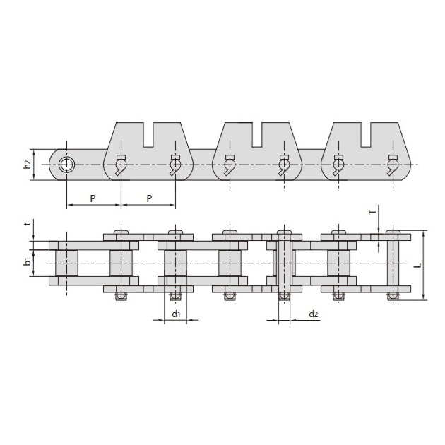 플레이트가 부착된 컨베이어 체인의 구조는 주로 두 부분으로 구성됩니다: 컨베이어 체인 본체와 플레이트입니다. 컨베이어 체인 본체는 일련의 베어링으로 구성되며, 이는 고정 효과를 가진 체인 플레이트에 의해 고정되어 있으며, 이들 간의 위치 관계는 매우 정밀합니다.